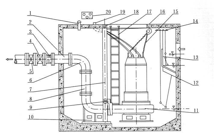 12.浮球(qiú)開關(水位開(kāi)關)13.隔闆 14.浮球(qiu)固定架 15.小鍊(lian) 16.挂鈎 17.人梯 18.支(zhi)撐架 19.電纜出(chū)線管 20.電機保(bǎo)護器