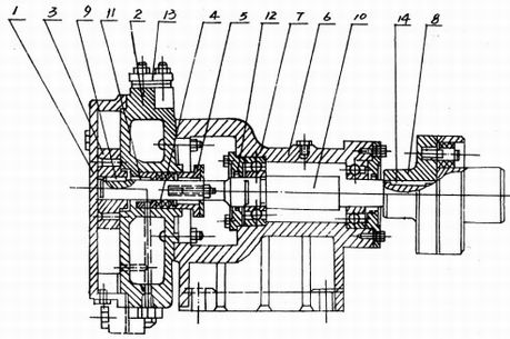 1.泵蓋 2. 泵(bèng)體 3. 葉輪 4. 填料(liào) 5. 填料壓蓋 6.托(tuō)架 7.滾珠軸承(chéng) 8. 聯軸器 9.葉輪(lún)平健 10.泵軸 11.填(tián)料環 12.軸承壓(ya)蓋 13.法蘭盤 14.聯(lian)軸器平健 技(jì)術參數: